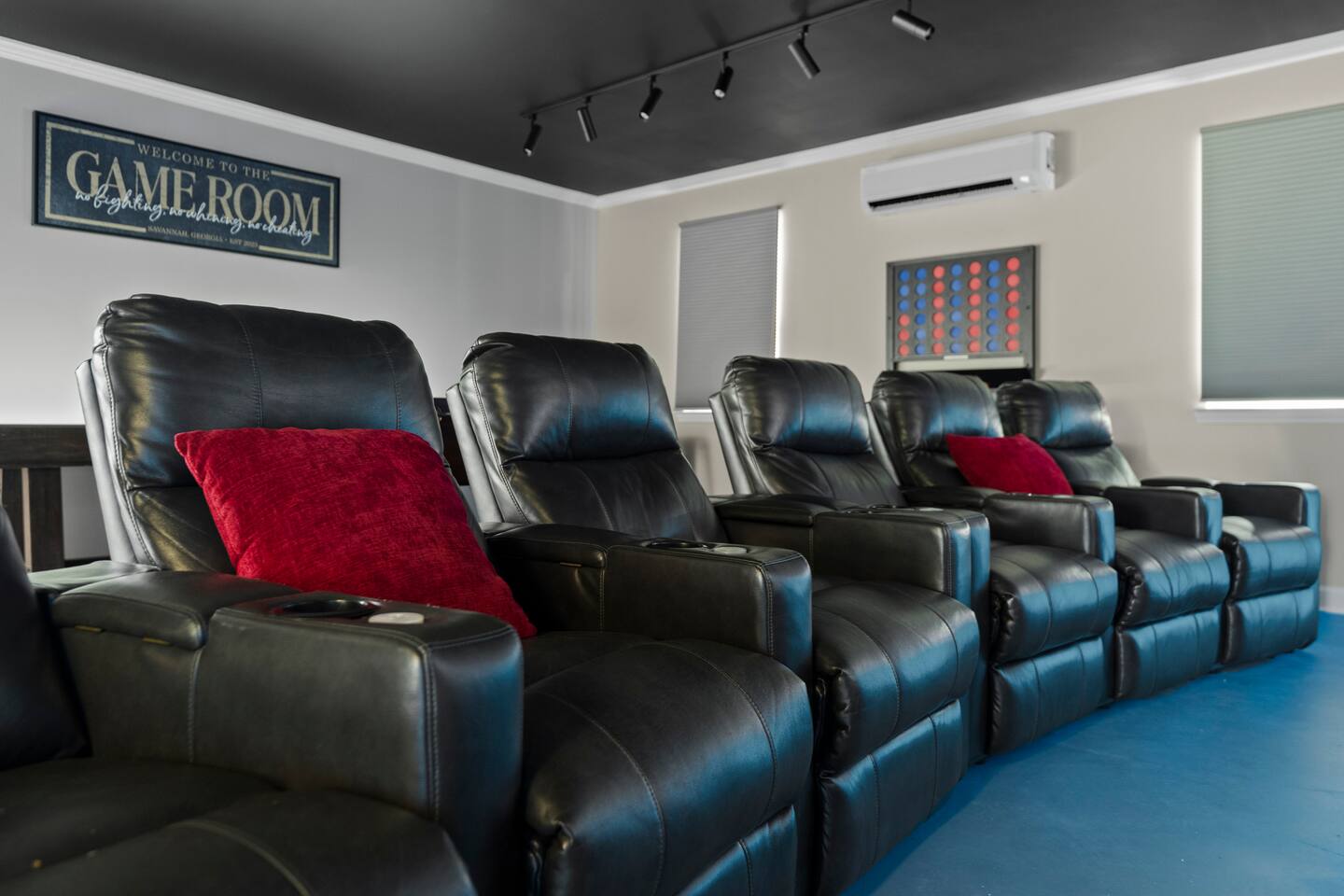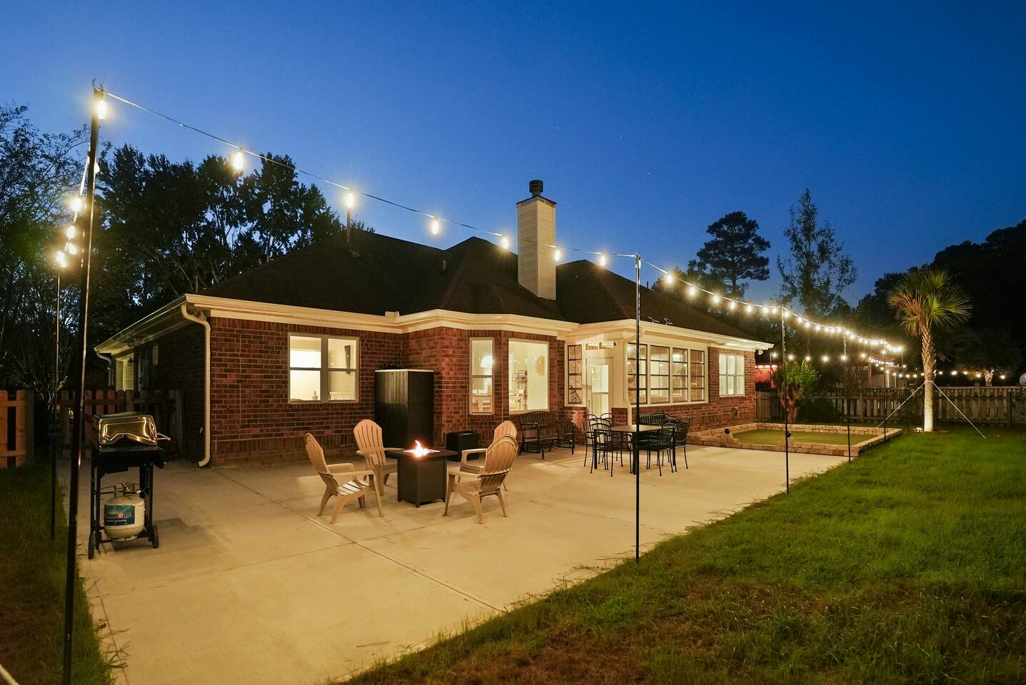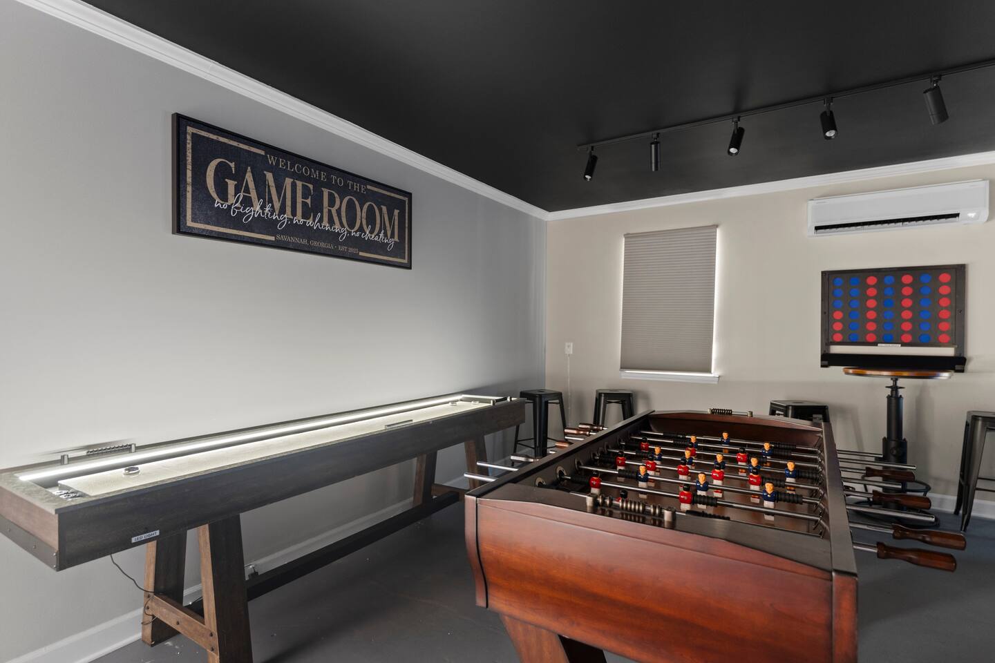 SLEEPING ARRANGMENTS - Bedroom 1: 1 King Bed; En-suite; 55” TV - Bedroom 2: 1 Queen Bed - Bedroom 3: 1 Full Bed - Bedroom 4: 2 Twin Beds - Additional Sleeping: 1 Portable Crib KITCHEN & DINING - Stove/Oven, Refrigerator, Microwave, Dishwasher - Fully Stocked Kitchen; Drip Coffee Maker & Keurig - Dining Table (6), Barstools (4) - Board Games INDOOR LIVING - Theater (86” TV)/Game Room (Shuffleboard, Foosball, Darts) - Living Room (75” TV) - Office w/ Massage Chair - Enclosed Porch (Double Egg Chair, Rocking Chairs) - Dining Table (6), Barstools (4) OUTDOOR LIVING - Putting Green (15x20) - Bistro Lights - Fire Pit (gas) - Grill (gas) - Dining Table - Lawn Games: Fowling, Cornhole, Kan Jam, Disc Golf, Giant Jenga, Boccee Ball, Football, Soccer ball TV’s & WIFI - Smart TV’s (86” Theater Room, 75” Living Room, and 55” Master Bedroom) - Complimentary streaming included: Youtube TV, NFL Sunday Ticket, Netflix, Disney +, Hulu - Nintendo Switch w/ Games (Mario Kart, etc.) - 1 Gig High Speed Wifi w/ 3 routers GENERAL - Central Heating & A/C, Ceiling Fans - Laundry (Full Size Washer & Dryer, Detergent, Ironing Board) - Premium Linens/Towels, Complimentary Toiletries, Hair Dryers - Keyless Entry PARKING - Driveway (3-4 vehicles) FAQ - No Shared Amenities - Exterior Security Cameras (facing out) NEIGHBORHOOD DETAILS - Quiet & Established Neighborhood - 4 Homes away from Clubhouse - City Club Golf Course (@Clubhouse) - Greenside Bar & Grill (@Clubhouse) - 2 Pools -Seasonal (@Clubhouse) - Tennis Courts & Pickleball (@Clubhouse) GEOGRAPHY - 1 Mile to Local Grocery, Stores, & Restaurants - 15 Minutes to Airport - 15 Minutes to Pooler - 30 Minutes to Downtown Savannah - 45 Minutes to Hilton Head - 55 Minutes to Tybee Island